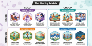 A highly effective way to audit your current lifestyle and identify what type of hobby you actually need is to use the Hobby Matrix. Developed in clinical treatment settings to help individuals build resilient routines, the matrix divides activities into four distinct quadrants based on two axes: Inside vs. Outside, and Solo vs. Group.