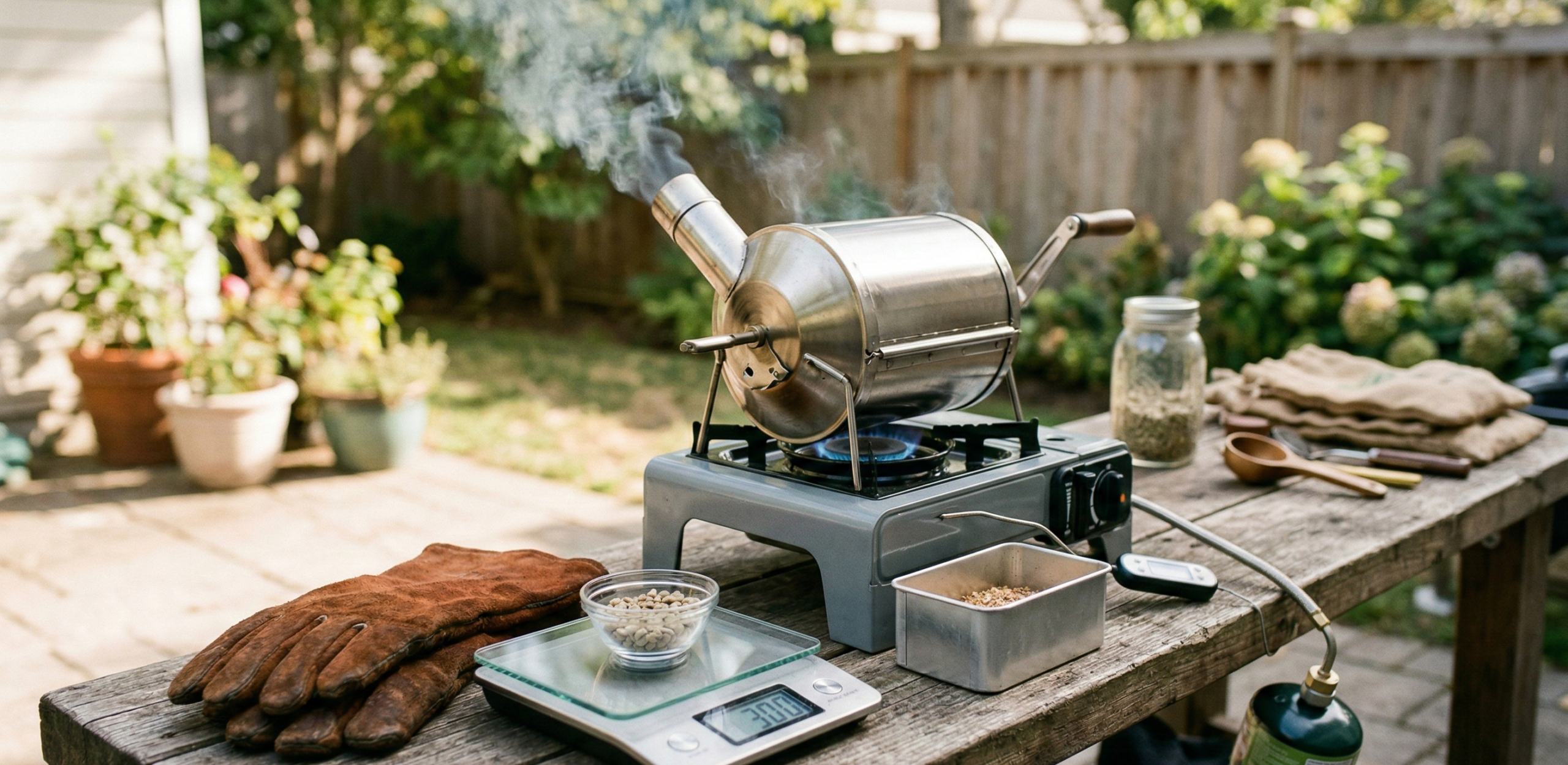 Keep a metal bucket with a tight-fitting lid nearby for safe chaff disposal, and never leave an active roast unattended. Always have heat-resistant gloves and a Class ABC fire extinguisher within arm’s reach.