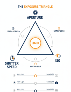 - Shutter Speed: How long the camera’s sensor is exposed to light. Fast speeds (1/1000s) freeze motion; slow speeds (1/30s) blur motion.