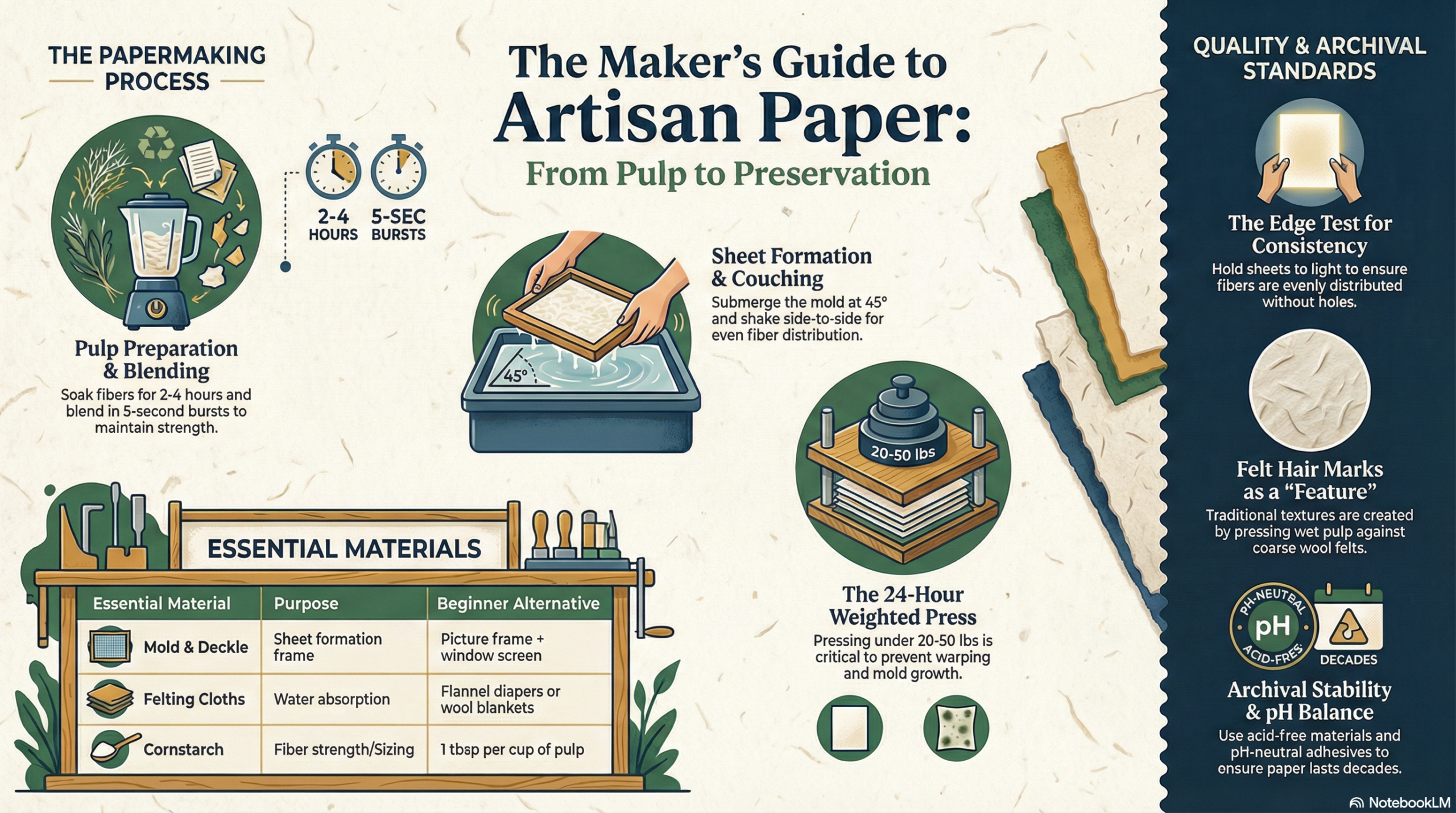 Trade-off note: It is tempting to over-blend the pulp to achieve a perfectly uniform slurry. However, over-blending mechanically chops the cellulose fibers too short, destroying their degree of polymerization (DP). Shorter fibers result in brittle, fragile paper that will likely tear when folded into book signatures.